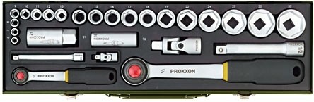Auto doppenset met 1/4“ en 1/2“- ratel, 27-delig (in stalen kist). Voor alle belangrijke auto-schroefmaten van 6 – 32 mm. Speciale bougiedoppen 16 en 21 mm. Overige inhoud zie afbeelding.